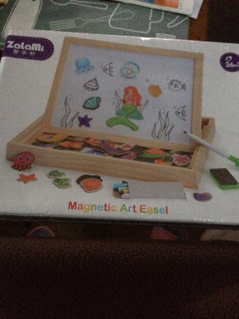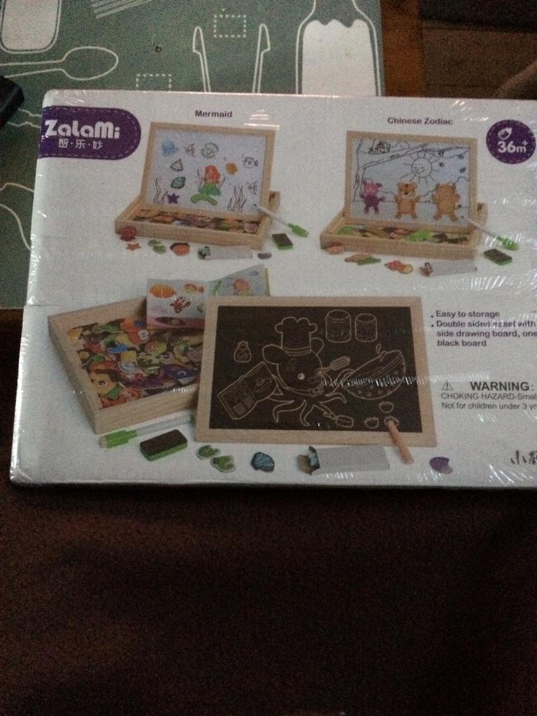 3-in-one game board, you can draw on the white side, on the blackboard and even assemble the pieces in the form of a puzzle. Ideal for small children (with supervision) since some pieces are very small.