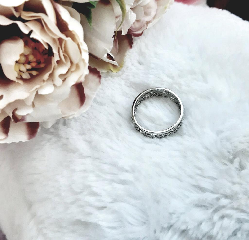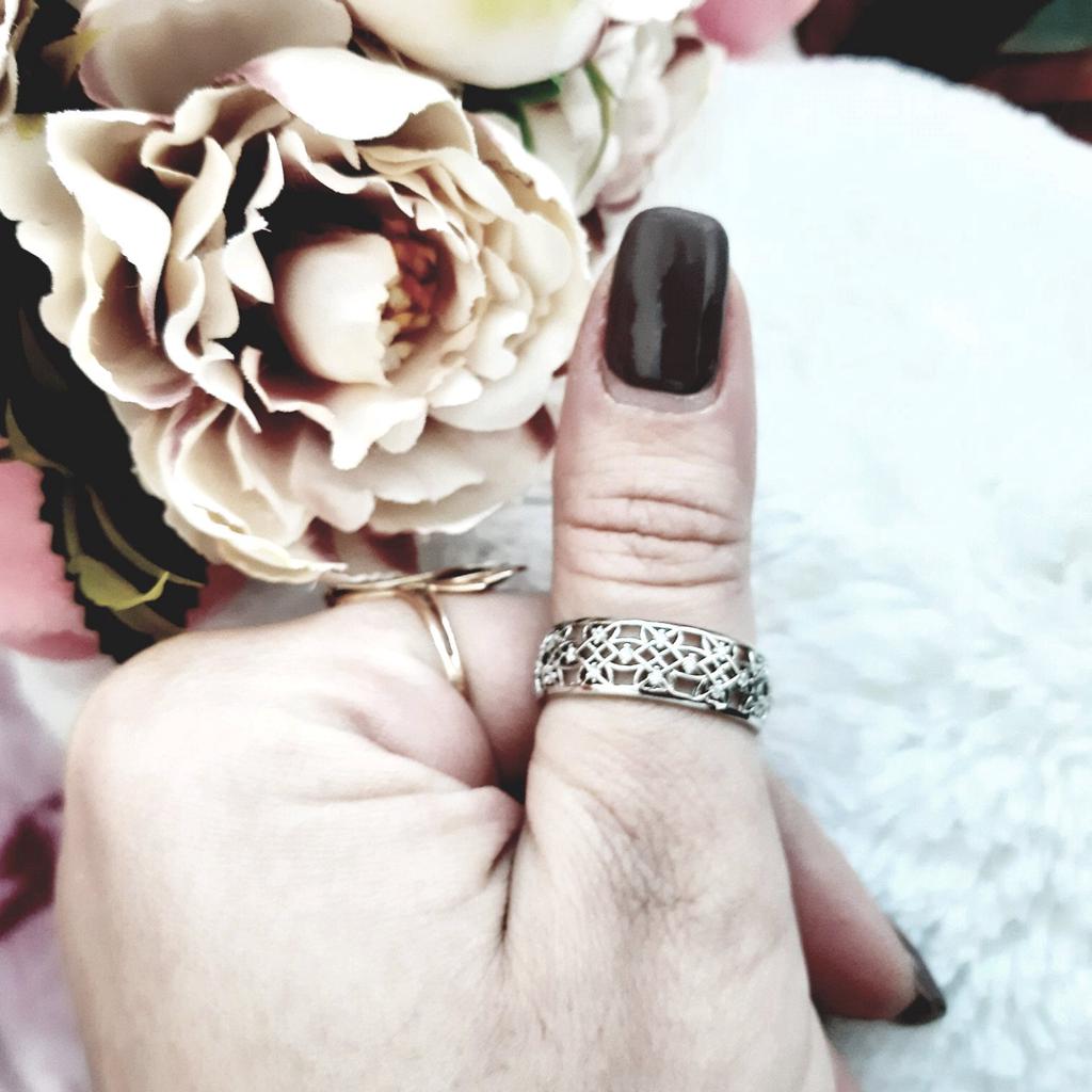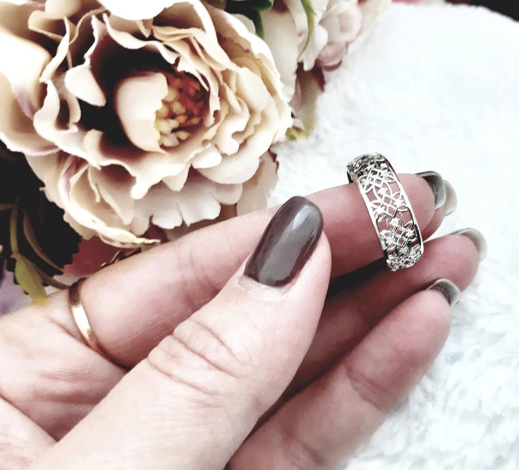 Spectacular ring Delivery two weeks after placing an order, packing a plastic bag. The ring is wide, but it looks nice, not massive. Every stroke, every detail is carefully done. I took with blue pebbles The material is an alloy of metals with silver plating, it looks spectacular. I really liked how the ring glitters and shimmers in the sun. Usually I wear size 18.5 and ordered size 9, the village is excellent. I liked the ring, I recommend buying