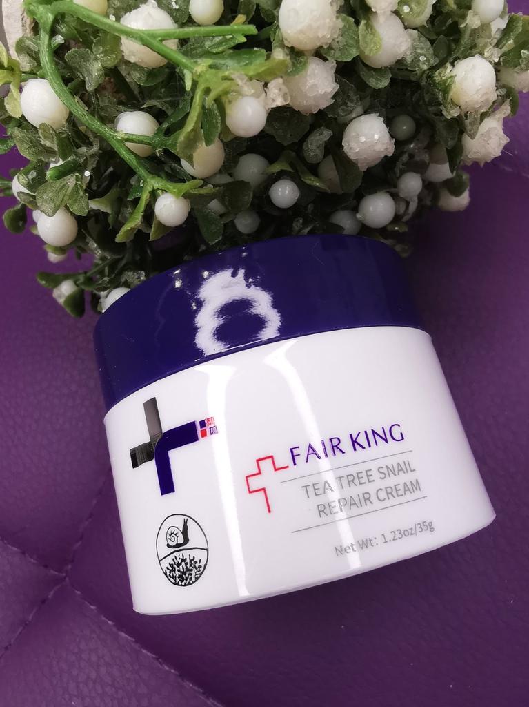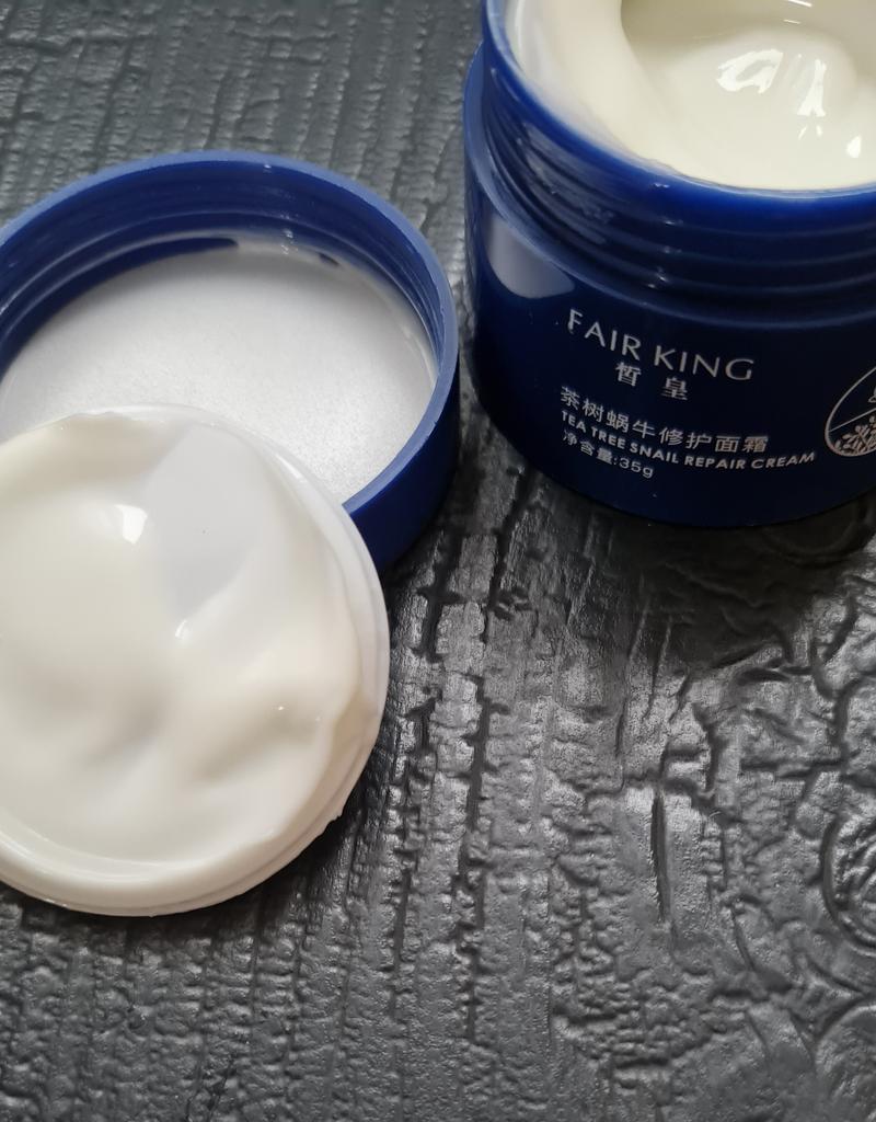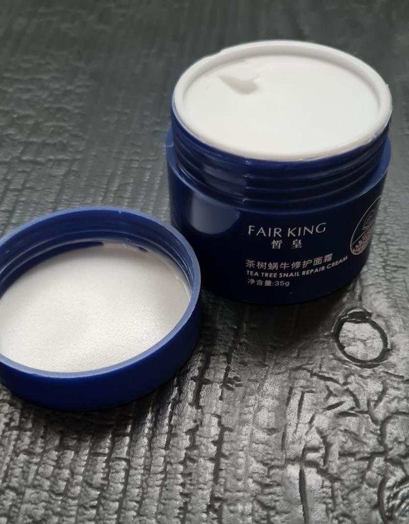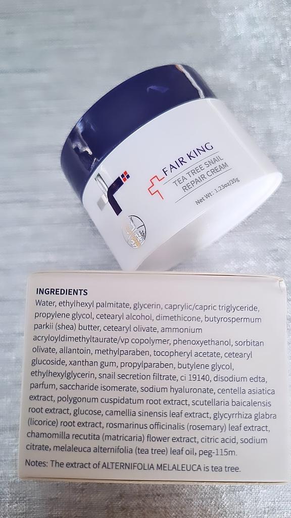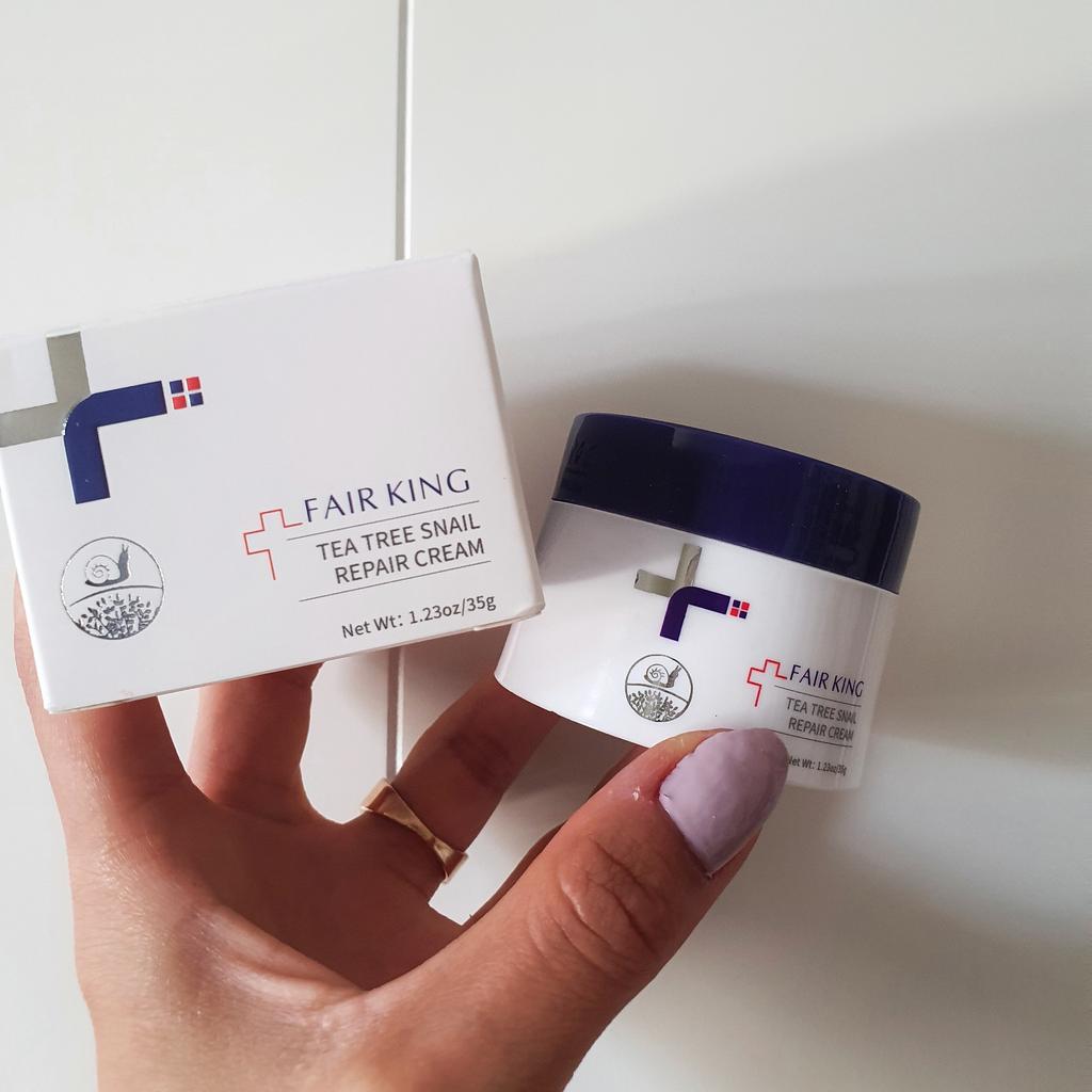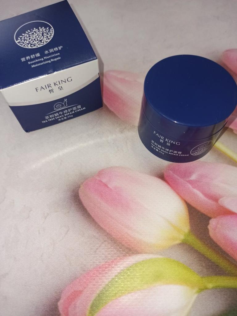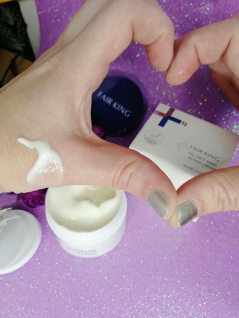 Tea tree & Snail Essence - Face Cream Brand: Fair King I was so curious about this facial cream, because it has a very interesting combination snail essence and tea tree. Tea tree is known for anti-inflammatory, anti-bacterial, anti-acne properties, it combats with oily skin. Tea tree oil can help soothe dry skin by reducing itching and irritation. Snail essence is rich in hyaluronic acid, and has been shown to exhibit antioxidant activities, stimulate collagen production, and enhance wound healing. 🔸anti-acne 🔸anti-aging 🔸moisturizing 🔸hyaluronic acid Cream has soft delicate texture. It smooths skin so well. It doesn't give greasy feeling. It is suitable for all skin types. Expiration date is 1 year later. I couldn't find the production date. It has 35g at total. If you have oily and you are around your 30s or more (mature skin), I recommend this cream. You're gonna like it.