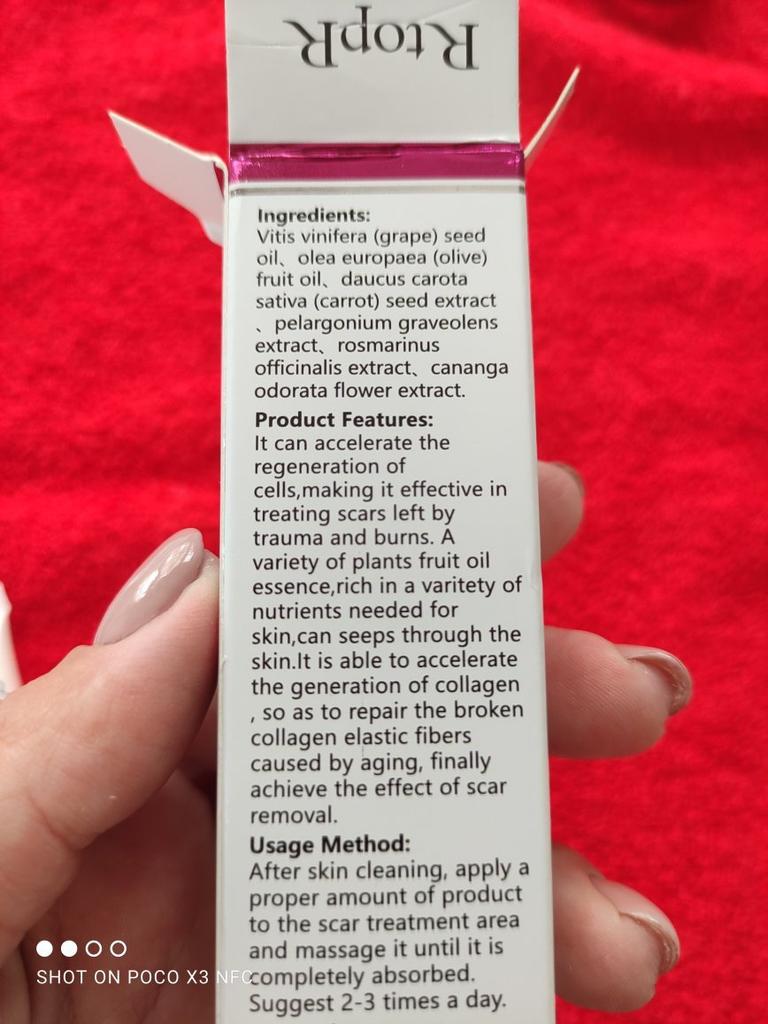 Kullanım Yöntemi:Cilt temizliğinden sonra skar tedavi alanına uygun miktarda ürün uygulayın ve tamamen emilene kadar masaj yapın. Günde 2-3 kez önerin.
