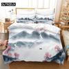 Japon Tarzı Nevresim Takımı Kız için Polyester Fuji Dağı Yorgan Kapak Kiraz Çiçekleri Çiçek Mürekkep El Boyalı Nevresim Takımı