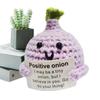 Komik mini tığ işi bebeğimiz ile tanışın! Birinci sınıf yün iplikten yapılmış bu elle dikilmiş bebekler yumuşaktır, rahattır ve basınç altında şeklini kaybetmez. Stresi atmak ve anında daha iyi hissetmek için onları sıkın. Her bebek, arkadaşlara, kız kardeşlere, iş arkadaşlarına veya aile üyelerine hediye etmek için mükemmel olan duygusal bir teşvik kartıyla birlikte gelir. Duygusal destek sağlayan meyve bebeklerimiz, canlandırıcı mesaj kartlarıyla değer verdiğiniz birinin yüzüne bir gülümseme getirecek. Kendinizi kaybolmuş veya rahatsız hissediyorsanız, turşularımız size yardımcı olmak için burada! Bu eğlenceli hediye tüm durumlar için uygundur ve sevdiklerinizi kesinlikle şaşırtacaktır.. Ailenize, çocuklarınıza, arkadaşlarınıza verin ve bu sevimli meyvelerle yakın arkadaş olmalarını sağlayın.. Karttaki motive edici sözler, stresli veya üzgün hisseden herkese ilham verecek ve onları neşelendirecek. Teşvik ve desteği ifade eden bir hediye olarak duygusal destek tığ işi bebeğimizi seçin. Bu eşsiz ve düşünceli hediyeyle pozitifliği ve neşeyi yayın!