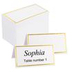 Zarif Tasarım: Bu masa kartlarının üzerindeki altın folyo kenarlar lüks ve zarafeti yansıtıyor; düğünler, ziyafetler ve özel etkinlikler için mükemmel. Mat yüzey, kolay yazmayı ve çabuk kurumayı sağlayarak sofistike bir sunum sağlar.