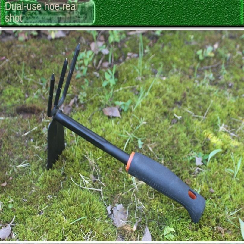 Thicken Serviceable Dual Use Small Hoe for Gardening Tool with Three Tooth Harrow Head, Iron Head Dual Purpose Hoe