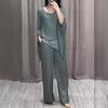 Takım elbise, geniş paçalı pantolonlarla eşleştirilmiş, modaya uygun çift katmanlı birleştirilmiş üst tasarıma sahip olup, her durum için maksimum konfor sağlarken figürü düzleştiren bol bir kesim sunar.