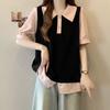 Yaz Akademi Tarzı Renk Bloklu Polo Yaka Üst Sahte İki Parçalı Kısa Kollu Tişört Kadın Bol Rahat Günlük Çok Yönlü Bluz