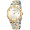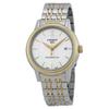 Stainless steel case with a two-tone (silver-tone and rose gold PVD) stainless steel bracelet. Fixed rose gold PVD bezel. Silver dial with black hands and Roman numeral hour markers. Dial Type: Analog. Date display above the 6 o'clock position. ETA caliber F06.115 quartz movement. Scratch resistant sapphire crystal. Pull / push crown. Solid case back. Round case shape. Case size: 40 mm. Case thickness: 6.97 mm. Band width: 20 mm. Butterfly clasp. Water resistant at 50 meters / 165 feet. Functions: date, hour, minute, second. Dress watch style. Watch label: Swiss Made. Tissot Carson Premium Quartz Silver Dial Men's Watch T122.410.22.033.00.