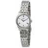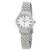Stainless steel case with a stainless steel bracelet. Fixed stainless steel bezel. Silver dial with blue leaf-style hands and Roman numeral hour markers. Dial Type: Analog. Date display above the 6 o'clock position. ETA caliber F03.115 quartz movement. Scratch resistant sapphire crystal. Pull / push crown. Solid case back. Round case shape. Case size: 30 mm. Case thickness: 6.7 mm. Band width: 15 mm. Butterfly clasp with a push button release. Water resistant at 50 meters / 165 feet. Functions: date, hour, minute, second. Casual watch style. Watch label: Swiss Made. Tissot Carson Premium Lady Quartz Silver Dial Ladies Watch T122.210.11.033.00.