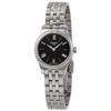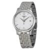 Stainless steel case with a stainless steel bracelet. Fixed stainless steel bezel. White dial with silver-tone alpha-style hands and alternating index and Roman numeral hour markers. Dial Type: Analog. ETA caliber E61.031 quartz movement. Scratch resistant sapphire crystal. Pull / push crown. Solid case back. Round case shape. Case size: 25 mm. Case thickness: 5.2 mm. Band width: 12 mm. Butterfly clasp. Water resistant at 30 meters / 100 feet. Functions: hour, minute. Casual watch style. Watch label: Swiss Made. Tissot Tradition Thin White Dial Ladies Watch T0630091101800.