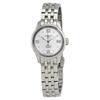 Stainless steel case with a white leather strap. Fixed stainless steel bezel. White mother of pearl dial with silver-tone hands and diamond-set index hour markers. Roman numerals mark the 3, 9 and 12 o'clock positions. Minute markers around an inner ring. Dial Type: Analog. Date display at the 6 o'clock position. Tissot calibre Powermatic 80 (C07.111) automatic movement with an 80-hour power reserve. Scratch resistant sapphire crystal. Pull / push crown. Skeleton case back. Case size: 32 mm. Case thickness: 10.69 mm. Round case shape. Band width: 16 mm. Fold over clasp. Water resistant at 50 meters / 165 feet. Functions: date, hour, minute, second. Dress watch style. Watch label: Swiss Made. Tissot Chemin Des Tourelles Automatic Ladies Watch T099.207.16.116.00.