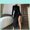 A High Necked Long Velvet Dress with a Slim Fit and Pleated Slit