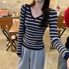 Women's Short and Unique Striped Long Sleeve T-shirt Knitted Base Top Slimming Blouse with Design Sense