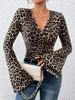Kadın Leopar Katmanlı V Yaka Volanlı Kol Slim Seksi Örme Tişört