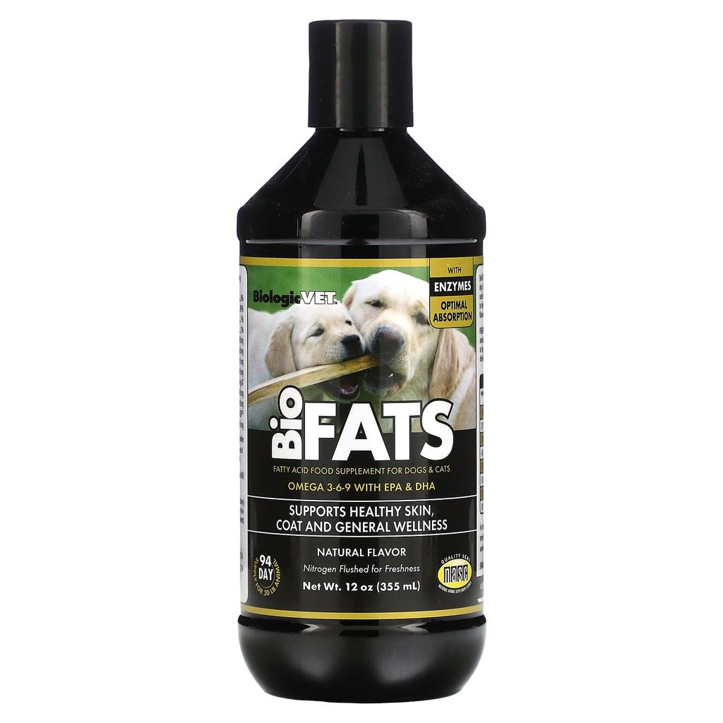 Product Description: Enzyme Optimum Absorption Fatty Acid Food Supplement for Dogs and Cats Contains Omega 3-6-9, EPA and DHA Supports Skin, Coat and Overall Health Filled with Nitrogen to Maintain Freshness 30 lb for 94 DaysNASC Natural Animal Supplements Council (QDA) Used and Recommended by Renowned Veterinarians BioFATS is a source of fatty acids that, when used regularly, help maintain your dog's normal skin, coat and metabolic health. BioFATS provides the correct ratio of omega 3-6-9 fatty acids to support your pet at all stages of life. Contains no artificial flavors, colors or preservatives.