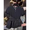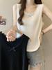 Black fake two-piece short-sleeved T-shirt for women summer bow embroidered waistcoat slim fit color matching chic temperament top