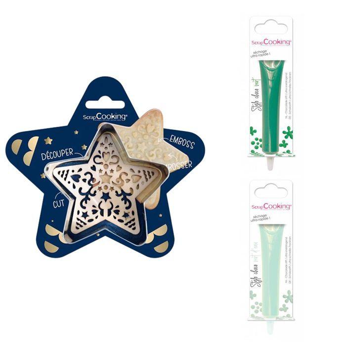 Kit pour biscuit en relief Étoile + 2 Stylos au chocolat vert et vert d'eau