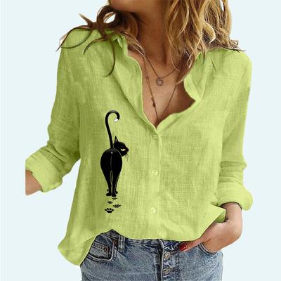 Kadın Moda Uzun Kollu Gömlek İlkbahar&yaz Günlük Pamuk Keten Üst Bayan Kedi Baskılı İnce Bluz