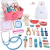 This 44-piece pretend play set makes a great gift for both boys and girls. It's also a great gift for Christmas, birthdays, or to celebrate kindergarten or higher education. Includes: 1 doctor's uniform, 1 nurse's cap, 1 medical record, 1 clip, 1 pencil, 1 rabbit doll, 1 stethoscope (3 pieces), 1 toothbrush, 1 dental drill, 1 oral mirror, 1 thermometer, 4 temperature controls, 1 syringe, 1 toothpaste (2 pieces), 1 ointment (2 pieces), 2 pills (3 pieces), 1 capsule, 1 eyeglasses, 1 bandage, 1 denture model, 8 movable teeth, 1 tweezers, 1 name tag (2 pieces), 1 scissors, 1 bulletin board, and 1 storage box (2 pieces).