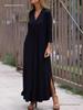 Yazlık Elbise Üç Çeyrek Kollu Yan Yırtmaçlı Bol V Yaka Cepli Midi Elbise