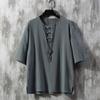 Büyük Beden Erkek Çin Tarzı Dik Yaka Pamuk ve Keten Tişört Erkek Bol Yarım Kollu Yazlık Tişört