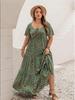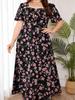 Büyük Beden Kare Yaka Çiçek Desenli Maksi Elbise Kadın Yaz Düğüm Ön Oyuklu Boho Tatil Büyük Etekli Elbiseler