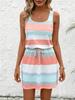 Kadın Gül Çiçek Sahte İki Parçalı Çizgili Baskılı Kolsuz Yuvarlak Yaka Elbise Bol Yumuşak ve Rahat Büyük Beden Elbise