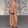 Bu zarif maksi elbise, düğmeli çıtçıtlı V yakası ve şık yarasa kolları ile sofistike ve trend bir görünüm sergiliyor. Düz renk tasarımı ve geniş stili, onu çeşitli vücut şekillerine uygun hale getirir ve çoğu kadın için çok yönlü bir uyum sağlar.