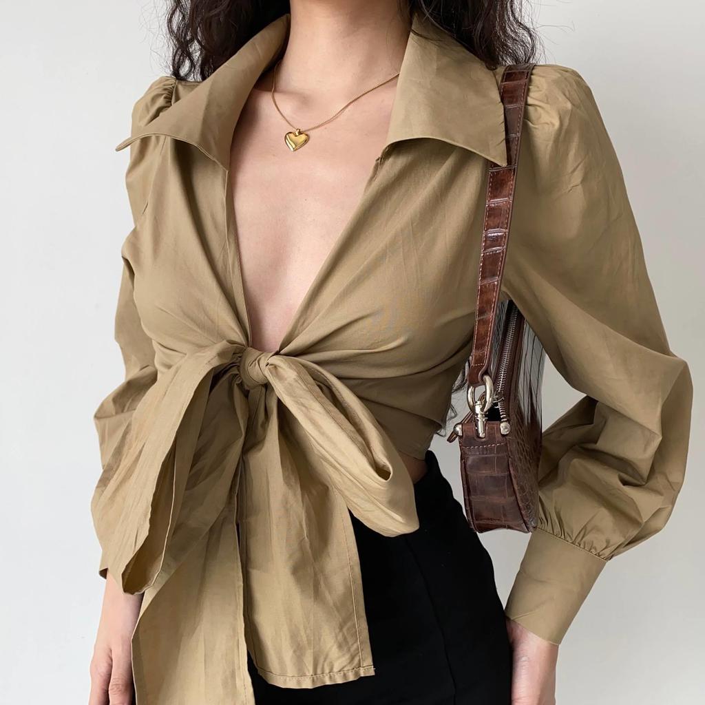 European and American Style Sexy Cross V-neck Tied Lantern Sleeve Shirt Women's High Waisted Short Lapel Top