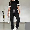 Bu şık iki parçalı setle silüetinizi geliştirin. Yuvarlak yakalı kısa kollu üst, dar bir kesim sunarken, pantolon ayarlanabilir konfor için bağcıklı bir bele sahiptir. Siyah takım, şık bir renk bloğu efekti için beyaz detaylarla vurgulanmıştır.