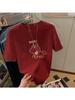 Bordo Kısa Kollu Kadın Tişörtü Yazlık Yeni Yıl Zodyak Yılı Kıyafetleri Bol Büyük Beden %100 Pamuk Üst