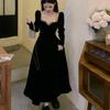 Kare Yaka Altın Kenarlı Kadife Elbise İlkbahar ve Sonbahar Yeni Retro Hepburn Tarzı Siyah Mizaçta Orta Boy Etek