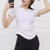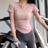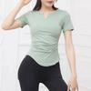 Women's Slim Fit V-Neck Yoga Outfit - Quick-Dry Pleated Short-Sleeve T-Shirt for Pilates, Fitness, and Running.