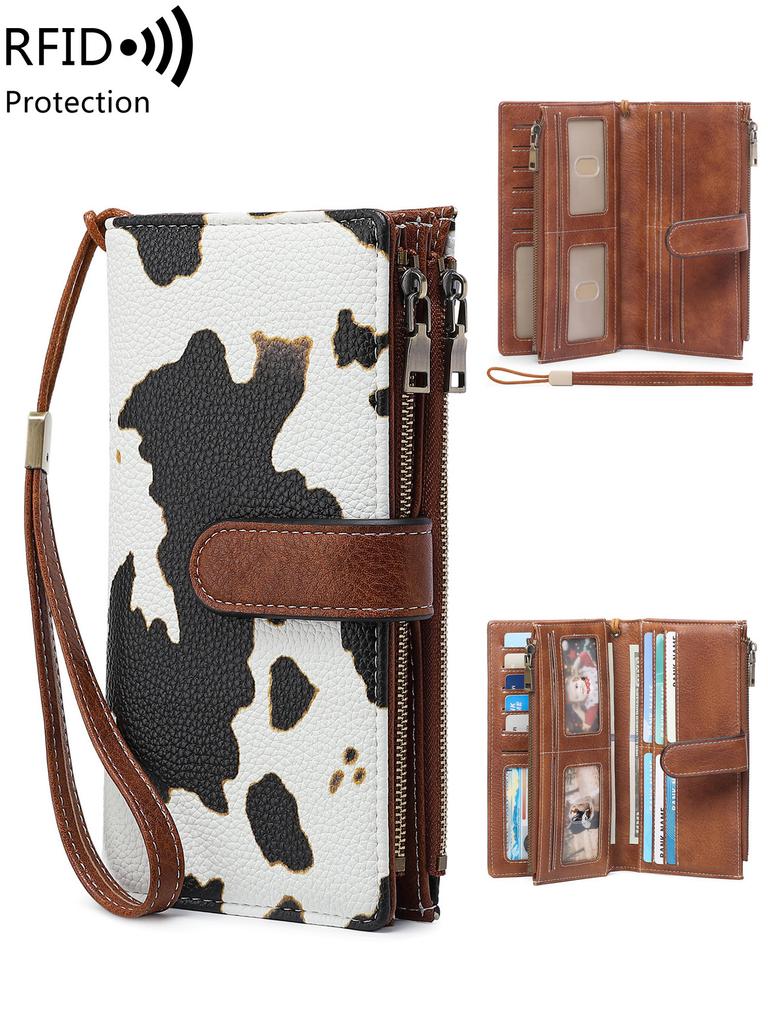 RFIDAnti-theft Trifold Ladies LongWallet Retro Multi-function Double Zipper Clutch Bag Multi-card Slot Coin Purse with Wristband