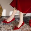Yeni gösteri kıyafetleri düğün ayakkabıları yıl düğün kadehi inci niş fiyonk kırmızı yüksek topuklu kalın topuk kadın ayakkabıları 2025