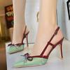 French temperament bow high heels female pointed head thin heel sexy fairy style one word buckle satin bag head sandals