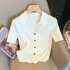 Kadın Yaz Buz Ipek Polo Yaka Üst Örme Kazak T-shirt Üst Benzersiz Kısa Kollu Tek göğüslü Düz Renk