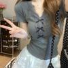 Kadınlar İçin Yazlık Yeni Kontrast Renkli Ön Omuz V Yaka Temel Tişört İnce Tişört Saf Arzu Nakışlı Fiyonklu Üst