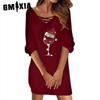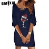 GMXIA Kadın Moda İlkbahar Sonbahar Düz Renk Baskı Uzun Kollu V Yaka Yüksek Bel Günlük Elbiseler