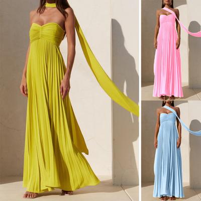 2025 Sınır Ötesi İlkbahar/Yaz Kadın Seksi Omuzdan Bağlamalı Pileli Şifon Uzun Elbise