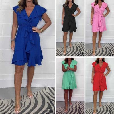 Women's Summer V-Neck Mini Dress Ruffle Cap Sleeve Short Wrap Dress Casual