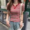 Yaz Dopamin Çizgili Tişörtler Kontrast Renkler Kadın Giyim V Yaka Düğmeli Temel Kısa Kollu Günlük Slim Kısa Kazaklar