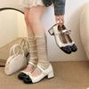 Temperament round head bow word with Mary Jane shoes women's 2025 spring light mouth thick heel single shoes silver small leather shoes