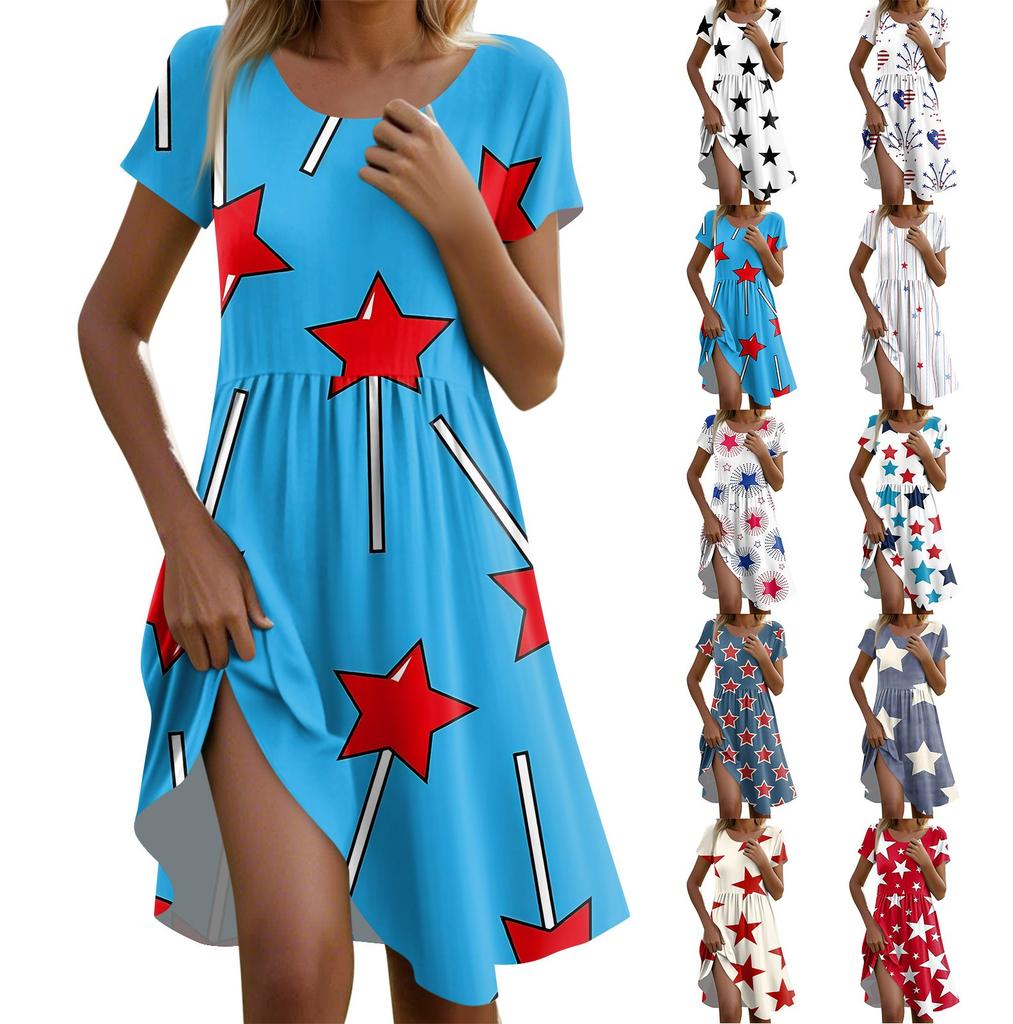 Women's Casual Fashion Round Neck Short Sleeve Independence Day Printed Midi Dress