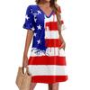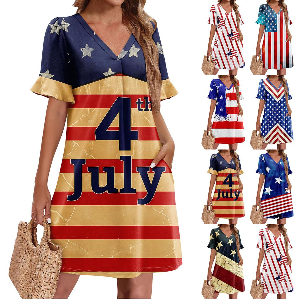 Summer Dresses For Women V Neck Ruffle Short Sleeve Casual Loose Independence Printing Dress Beach Dress With Pockets