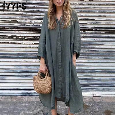 YYFS Kadın Modası İlkbahar Sonbahar Düz Renk Baskılı Uzun Kollu V Yaka Bol Bel Günlük Elbiseler