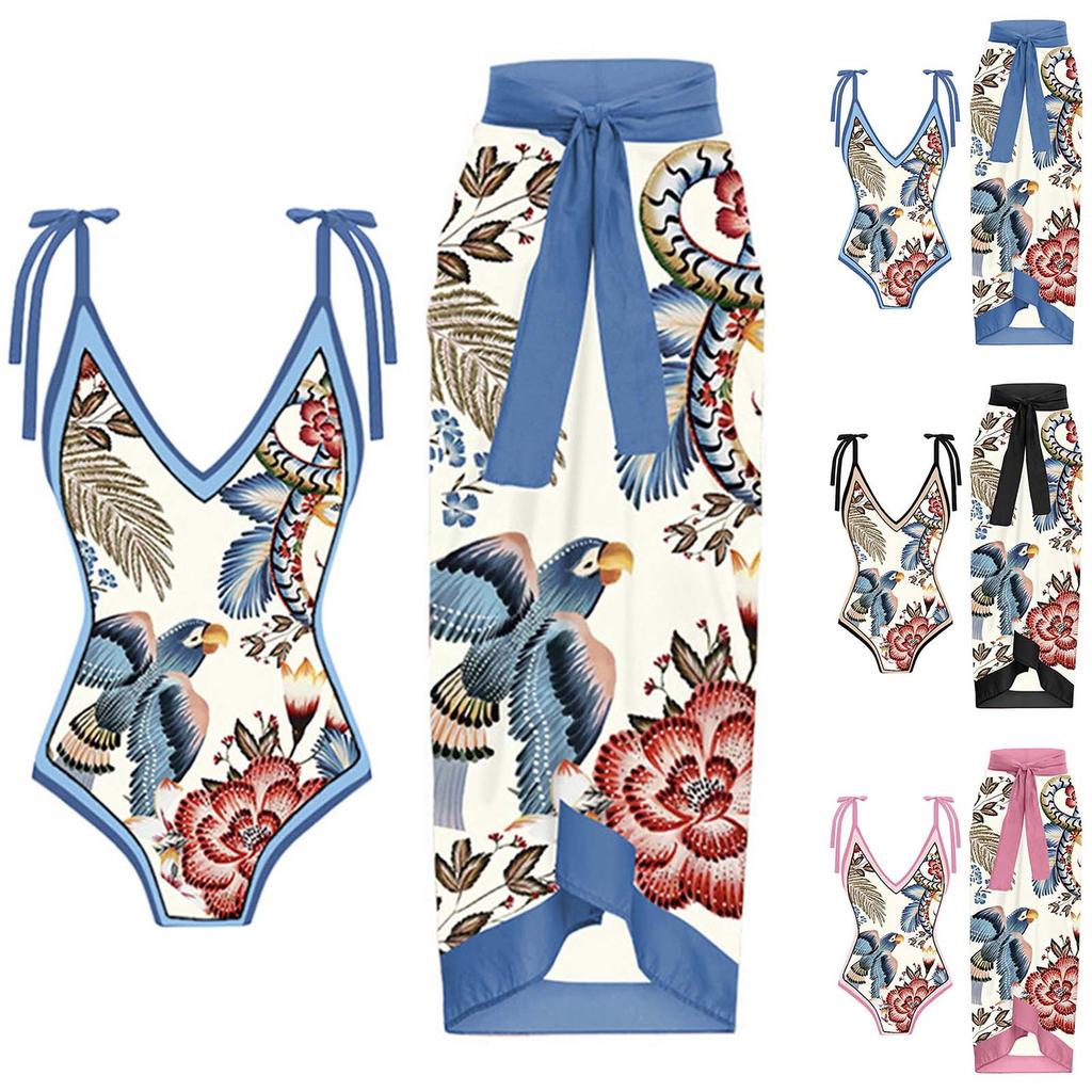 Kadın Modası Retro Baskılı Muhafazakar Tek Parça Plaj Elbisesi Seti (Sütyen Pedli ve Çelik Sütyensiz 2 Parça Set)