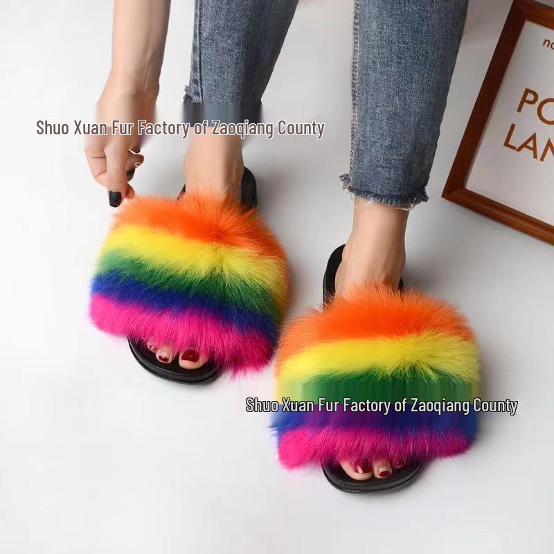 Women's Summer Fox Fur Slippers: Celebrity Trend, Flat Fur Sandals, Soft-Soled Flip Flops, Euro-American Style.