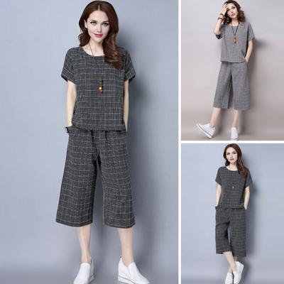 Yaz Kadın 2 Parça Set Yuvarlak Yaka Kısa Kollu Bol Kesim Üst Anne Setleri Ekose Elastik Bel Pantolon Takımlar 2 Parça Büyük Beden