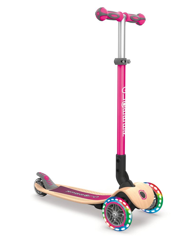 GLOBBER Kickboard Flash Light 3 Wheels Wood Deck Foot Brake Outdoor Play Kids Vehicle Kick Scooter Navy Pink WLGB436110 Primo/Foldable/Wood/Light