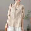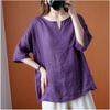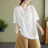 New retro cotton and linen top women's loose and thin V-neck short-sleeved jumper casual solid color T-shirt linen shirt summer
